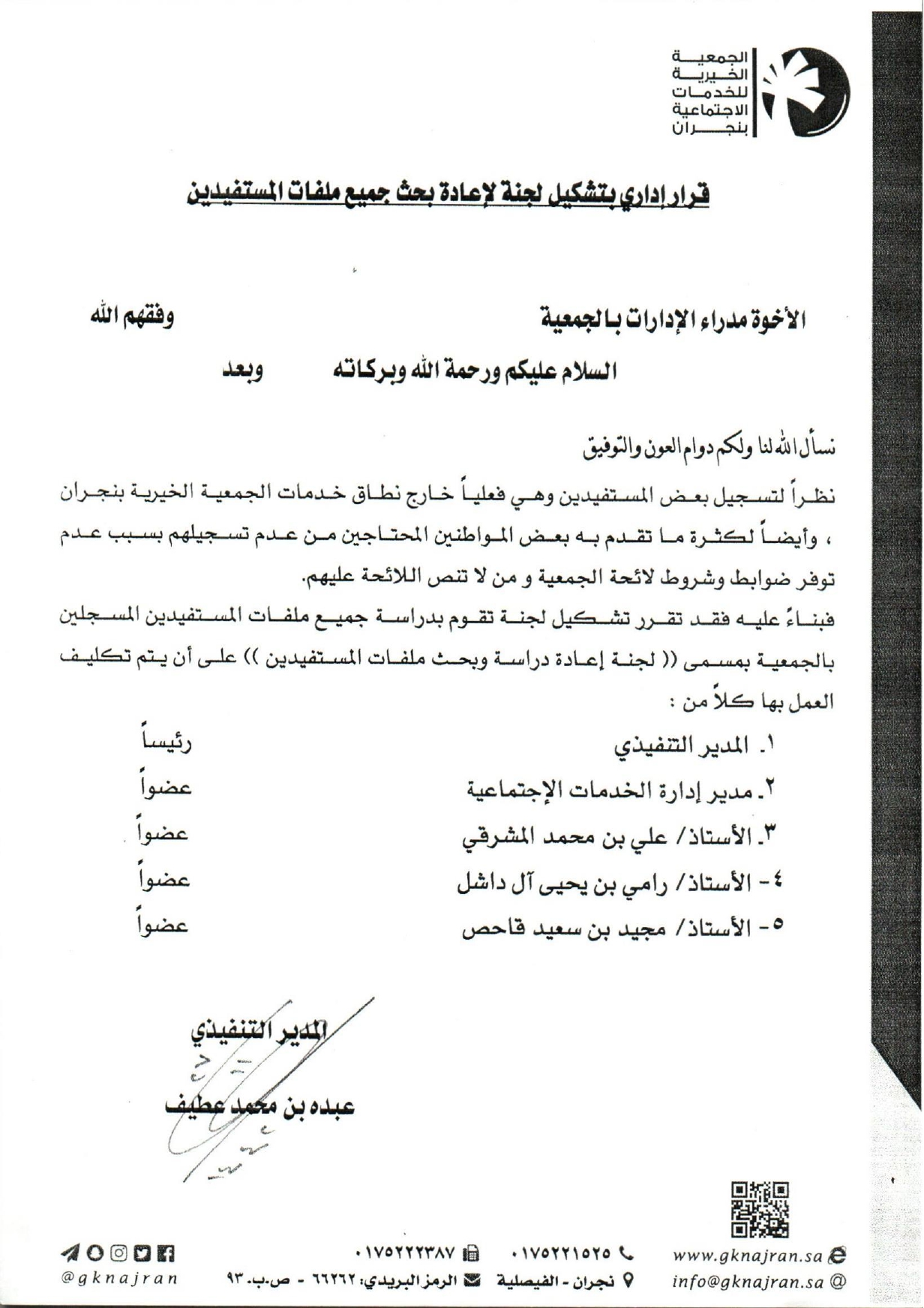 لجنة تدقيق وبحث ملفات المستفيدينأعضاء اللجنة1. سعادة الأستاذ/ عبده محمد عطيف.2. الأستاذ/ علي بن منصور الجفالي.3. الأستاذ/ علي بن محمد المشرقي.4. رامي يحيى آل داشل.5. مجيد بن سعيد آل قاحص. مهام اللجنة واختصاصاتها:1. تجهيز سجلات انتساب المستفيدين للجمعية مع مراعاة أن تلامس جميع الجوانب المتعلقة بالمستفيد .
